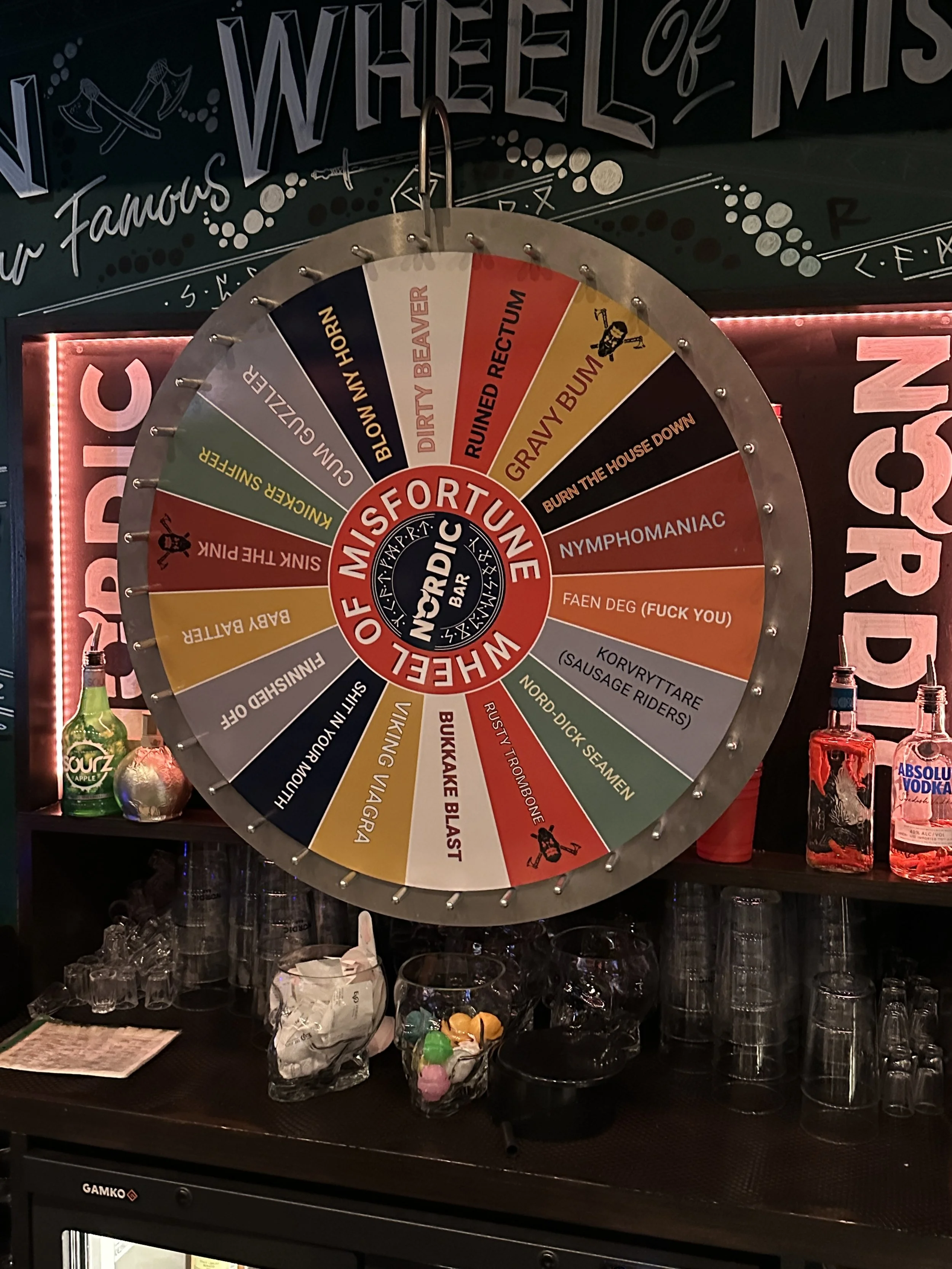 The Nordic Bar had folks sitting and watching a football (soccer) game and a live guitar player near the entrance stairwell. It was an average sports bar, but with a twist: a giant wheel full of different shots with incredibly raunchy names.