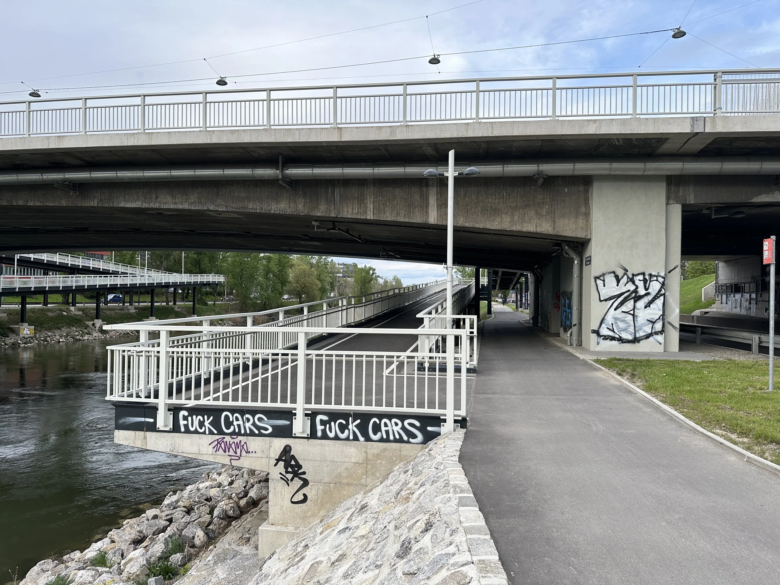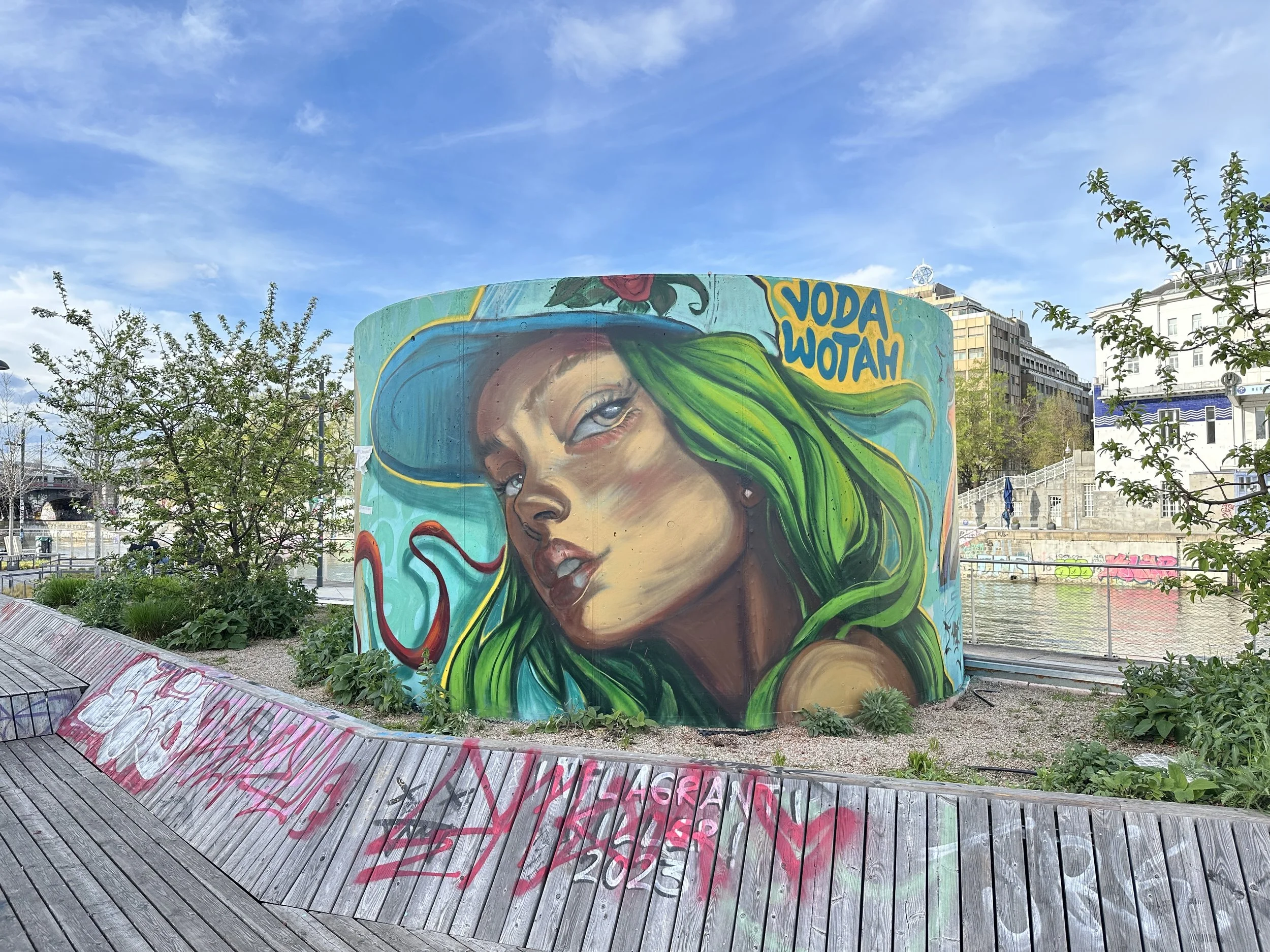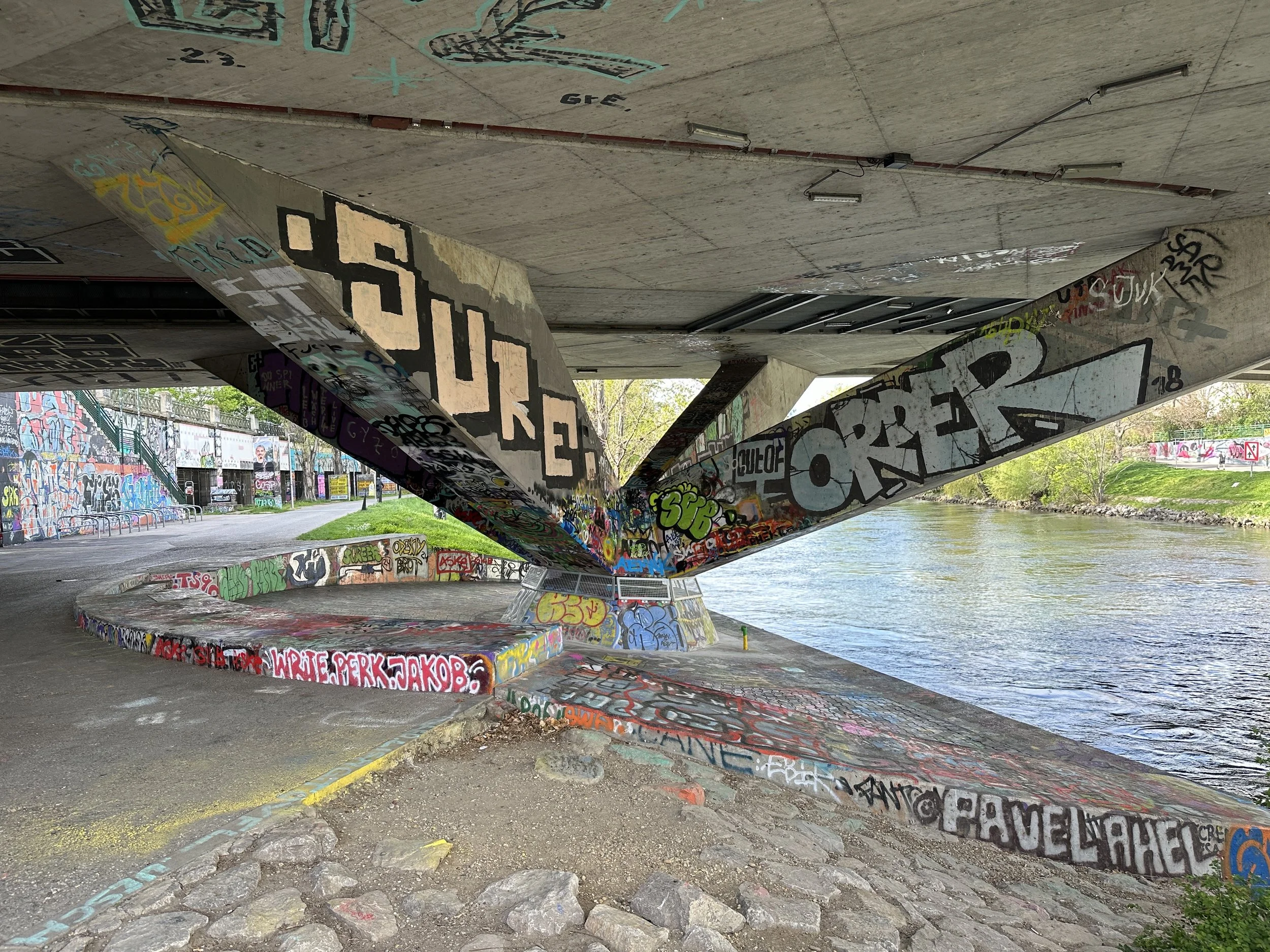 The highlight of Vienna was the Donaukanal. It was an offshoot of the Danube River that split off into its own canal for a couple miles before rejoining with its parent. The wide banks of this canal were elevated over the waters, but still a good ~30 feet (~10 meters) below the city streets. The promenade was paved but had plenty of benches, tables, and portions of grass, which altogether created a recreational walking area with plenty of little places to stop and have a picnic or get a beer at a mini bar. The coolest part of this area, by far, was the actual miles of graffiti lining either side of the promenade’s walls. It was an endless string of impressive urban art. I started to stroll along the promenade, listening to my Spotify Discover Weekly playlist (this updates regularly with new music). Plenty of bikers and runners whizzed past me as I stopped to take photos every hundred feet or so. I’ll let the art speak for itself: