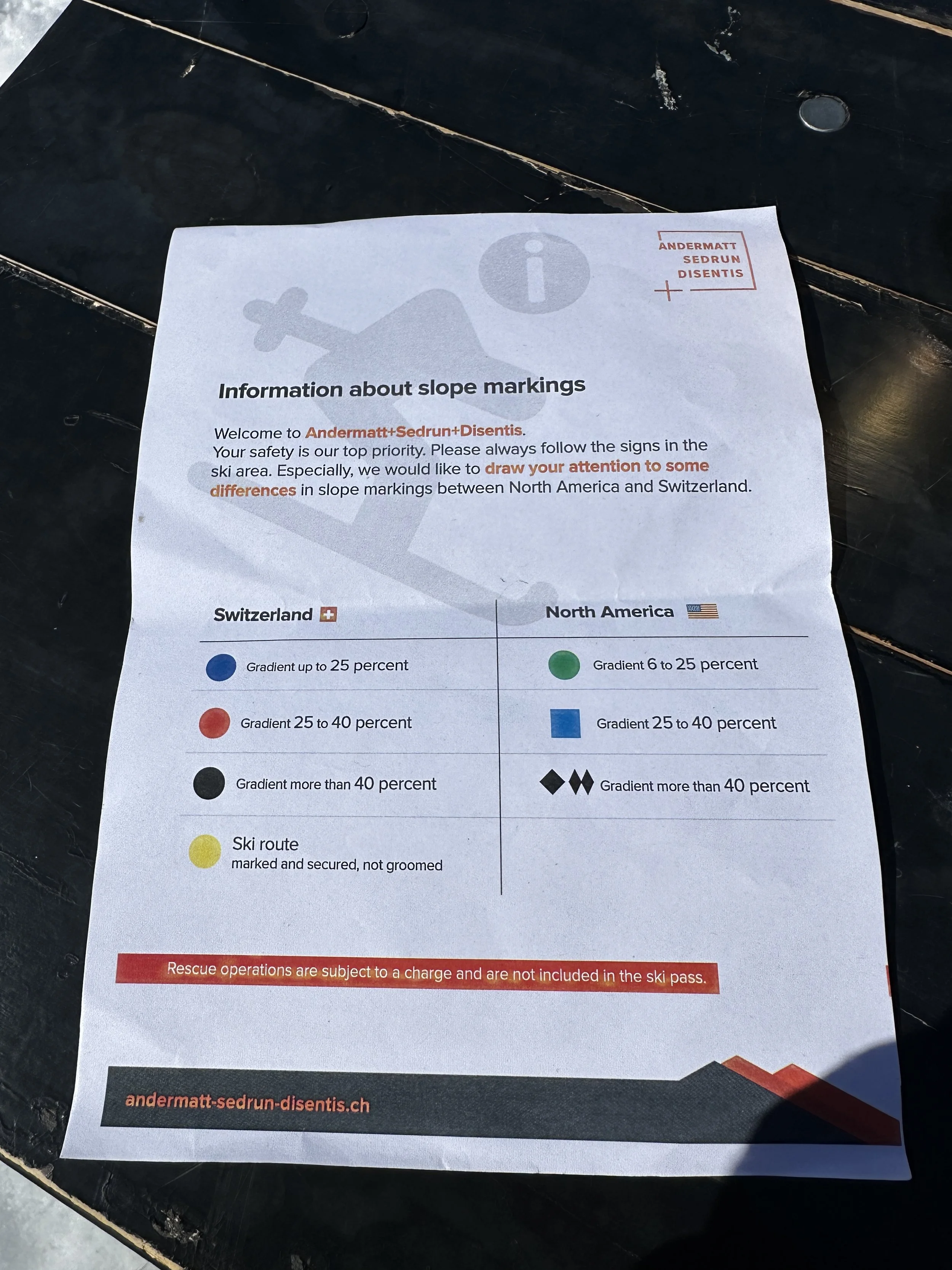 The ski slope grading system for runs is different in Europe. The ticket window attendant gave me a nifty little guide.