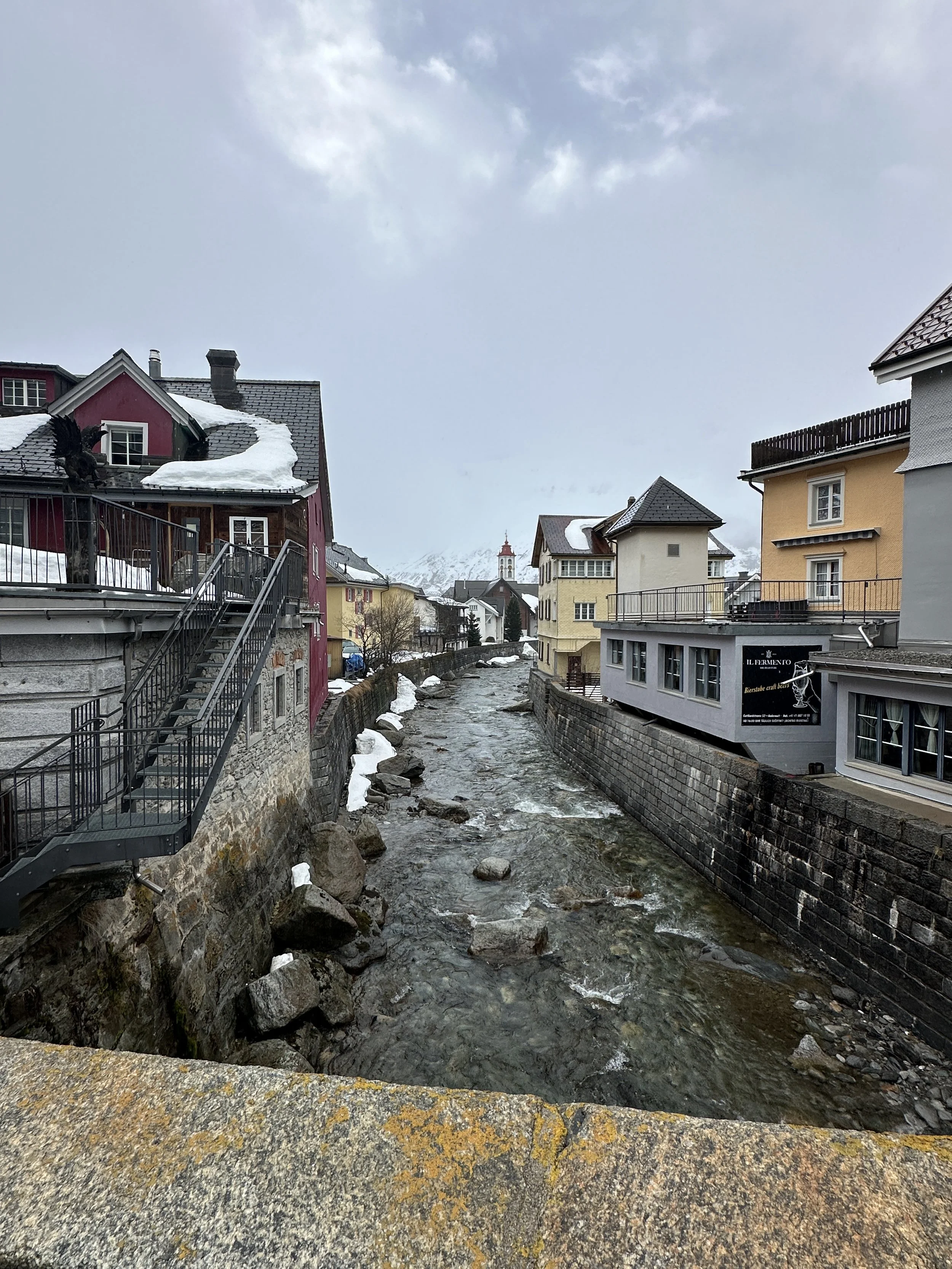 I arrived in the early afternoon so I could pick up my ski pass, rent my gear, and get situated in my hotel room. I checked out the cute little town of Andermatt. It’s a quaint little place, with a healthy creek flowing through its center. A bell tower nearby rang every 15 minutes, and the bells went crazy at the top and bottom of every hour.