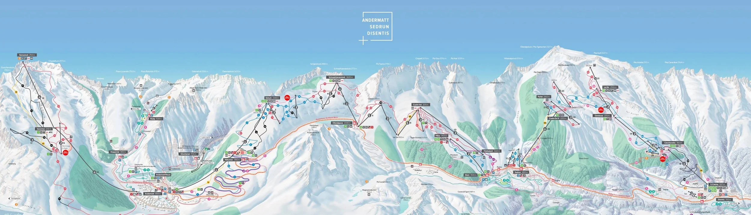 Andermatt-Sedrun-Disentis is the full name of this ski resort. It spans several miles across three separate towns, with slopes on each side of the towns. There’s a train that runs between the towns - it takes over an hour to ride the train from one end to the other!
